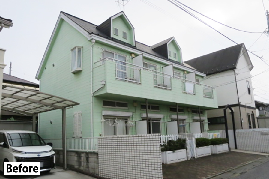 改修工事のきっかけは、ポラスグループ内の賃貸管理部門であるビル管理が建物の経年劣化の状況をみてオーナー様に改修工事の提案をしたことでした。改修工事をするにあたり、オーナー様からのご要望は「かっこいい外観にしたい」でした。そこで、単色だったアパートをツートンカラーにさせていただくこととなりました。