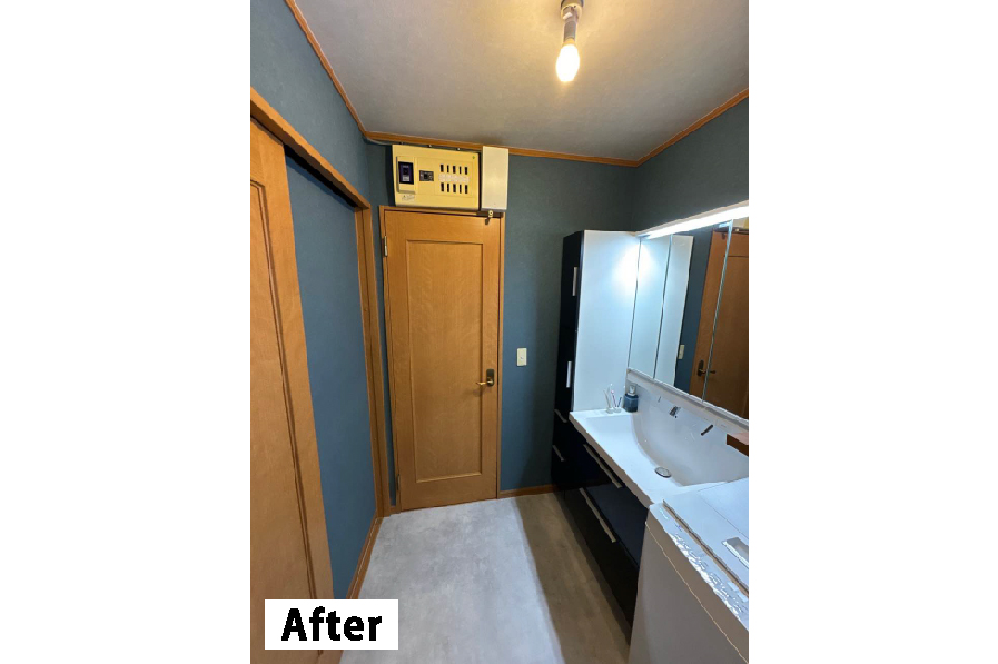 壁クロスをネイビー、床を薄いグレー、化粧台の扉色を深いグレーとして